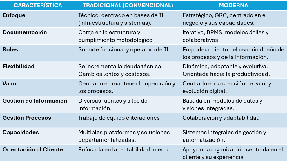 Ya estamos viendo una arquitectura empresarial (AE) basada en la agilidad, la evolución digital, el enfoque centrado en capacidades y la integración estratégica entre negocio y tecnología. Por lo tanto, la AE le permite a la organización adaptarse rápidamente al cambio. El enfoque actual se caracteriza por ser iterativo, centrado en el valor y soportado por información de calidad. En consecuencia, la organización puede tomar mejores decisiones en línea y anticiparse a las necesidades de sus clientes. A través de la inteligencia artificial – IA es posible asegurar la calidad de la información y explotarla de la mejor forma. Por otro lado, se supera el enfoque rígido y puramente técnico de TI del pasado.